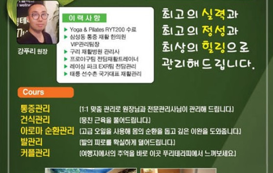 | 관리사님 | 강푸리 [남/한국인] 원장님 ✿ ✿ ✿ 테라피 경력 : 17년 ✿ ✿ ✿ ① 연예인.스포츠선수.국가대표 다수 관리 경력 ② 삼성동통증재활한의원 vip관리팀장 근무경력 ③ 구리 재활병원 교육팀장 근무경력 ④ 프로야구팀 전담 트레이너 근무경력 ⑤ 레이싱파크exr팀 전담재활트레이너 근무경력 ⑥ 태릉선수촌 국가대표 재활관리 근무경력 ⑦ 뉴욕 RYT200 자격증 보유(Yoga&Pilates) ⑧ cst 전문과정 수료 |