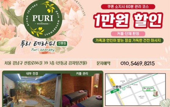 | 업체소개 | 《 푸리테라피 》 1인샵 강남 홈케어 서울 수도권 전역 관리 남여고객 커플환영샵 연예인 스포츠선수 국가대표 다수관리 테라피 다년간경력 |